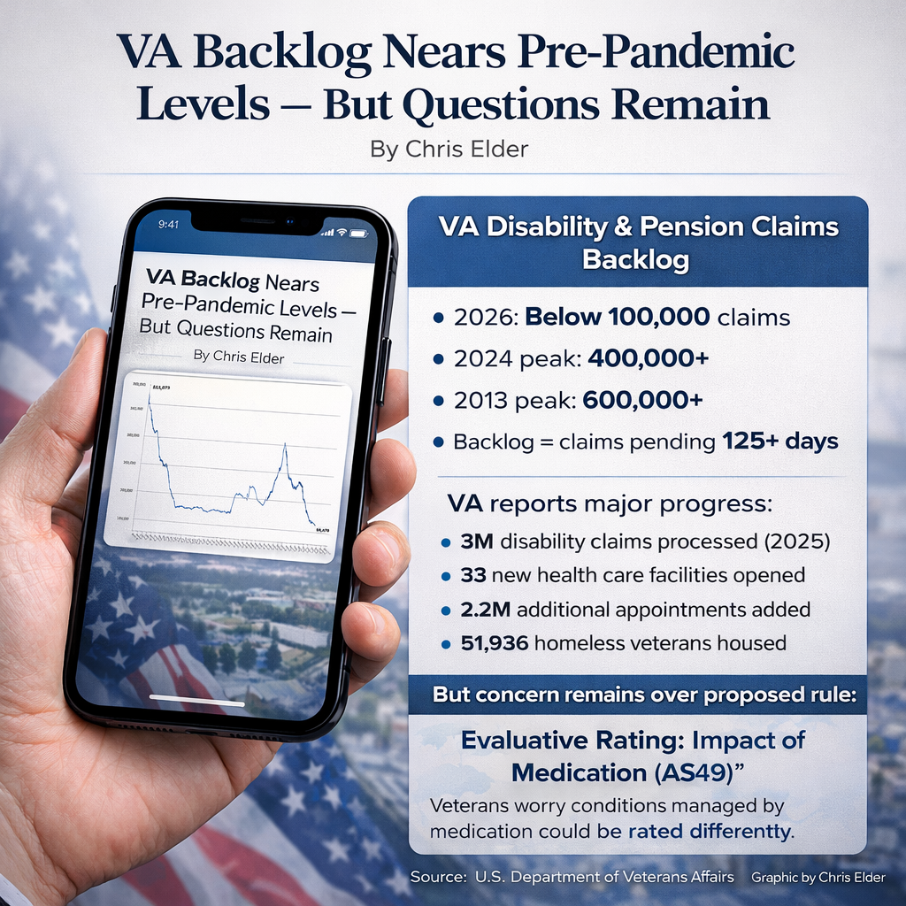 On February 23, 2026, the Department of Veterans Affairs announced that the backlog for VA disability and pension benefits has remained below 100,000 claims, nearing pre-pandemic levels.
